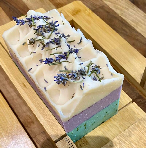 Ingredients: Golden Gurnsey Goats milk, Coconut Oil, Shea Butter, Olive Oil, Castor Oil, Lye, Rosemary Essential oil, Lavender Essential Oil, parfum, dried Lavender, dried Rosemary, mica powder