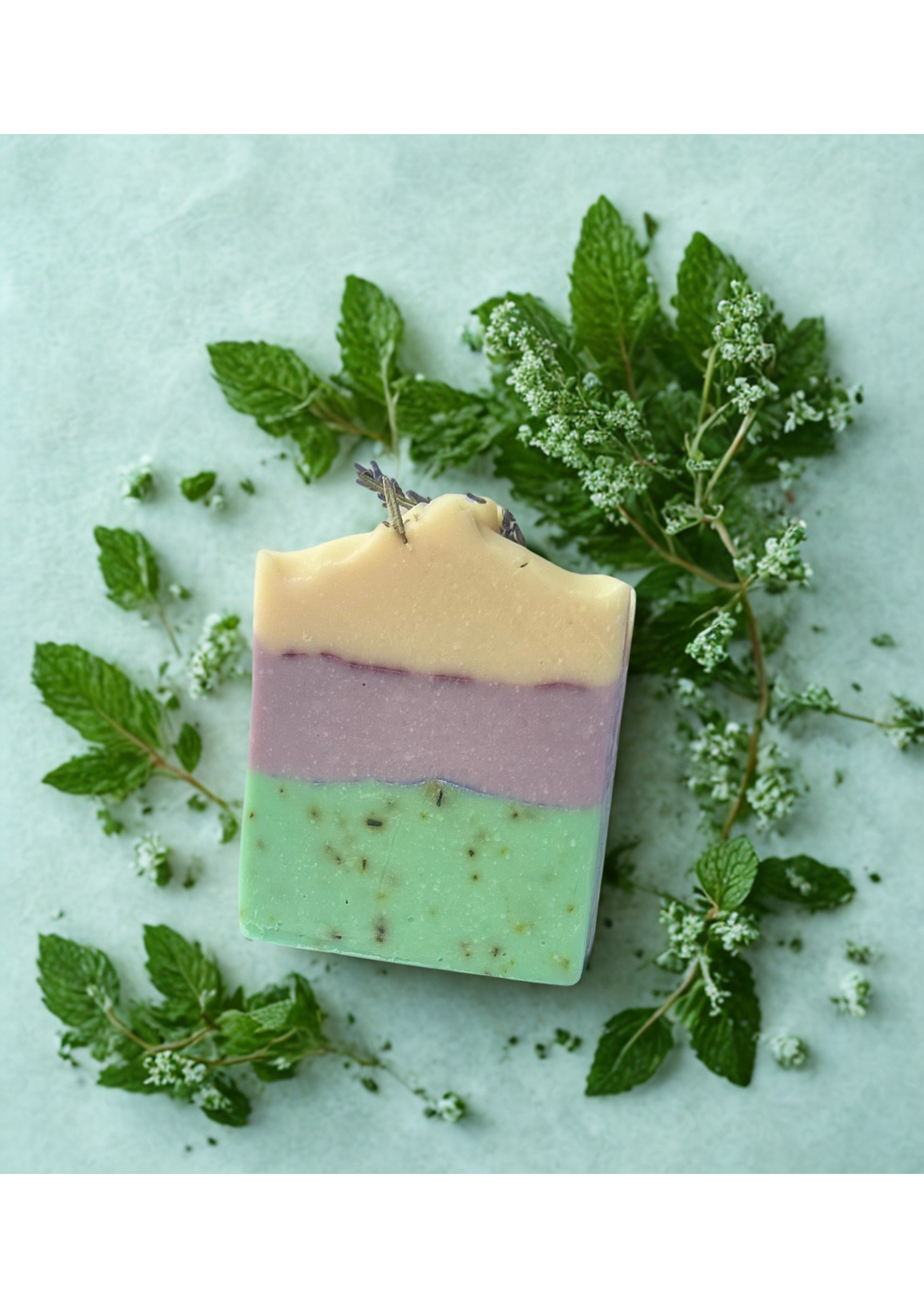 Farm dried Rosemary is incorpated into the green part of the bar as a gentle exfoliator. Farm dried Lavender & Rosemary line the top of the bar showing you how natural this soap is. The goats milk & coconut oils combine to produce a lovely creamy lather that helps to condition your skin.